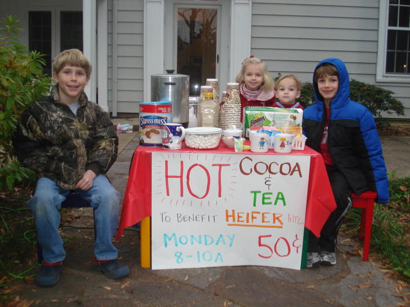Junior Heifer supporters braved a cold morning in Little Rock, Ark., earlier this month to tempt neighbors and passersby with steamy mugs of hot drinks. All proceeds went to Heifer International. Teddy Jones and his friend John Maris, both age 7, teamed up on the hot cocoa stand after they were inspired by a Read to Feed program they participated in at Episcopal Collegiate School.